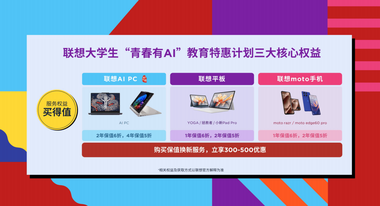 服務(wù)權(quán)益是聯(lián)想為廣大學(xué)子量身定制的“保值換新”服務(wù):聯(lián)想AI PC產(chǎn)品2年6折保值、4年5折保值;聯(lián)想平板1年6折保值、2年5折保值,聯(lián)想moto AI手機1年6折保值、2年5折保值。比如拯救者筆記本電腦換新服務(wù),學(xué)生專屬價直降400元,僅需399元即可享受。靈活的換新機制以及極高的保值比例,打破了3C產(chǎn)品一貫以來“拆箱9折、使用對折、一年骨折”的保值困境,大學(xué)生們在面臨AI設(shè)備的換新周期時,聯(lián)想AI終端的高保值,可以極大地減少經(jīng)濟負(fù)擔(dān),設(shè)備常換常新。聯(lián)想把換新服務(wù)的周期最長定在了4年,部分為2年,正好符合大學(xué)生的在校時間年限,或是設(shè)備的非常好的換新周期,保障了高校學(xué)子獲得充沛的設(shè)備性能支持。