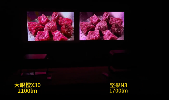 大眼橙X30激光投影儀在亮度上秒殺同價位普通低亮偽4K產(chǎn)品,比如堅(jiān)果N3亮度為1700CVIA,Vidda大眼睛M2 Pro亮度更是僅為1200CVIA,低亮度下的4K畫質(zhì)效果大打折扣。三款產(chǎn)品都采用了0.47英寸DMD芯片,原生分辨率為1080P,所謂的4K其實(shí)是“偽4K”。真正的原生4K畫質(zhì)擁有880萬像素,而0.47英寸DMD芯片通過抖動模擬的“偽4K”,實(shí)際像素僅207萬,清晰度相當(dāng)于1080P。這就像手機(jī)屏幕,更大的芯片意味著更密集的像素點(diǎn),畫面自然更細(xì)膩,尤其是在投射100英寸以上大屏?xí)r,真?zhèn)?K的差異會更加明顯。所以618選擇激光投影儀時,對于清晰度宣傳4K的產(chǎn)品,一方面我們要認(rèn)真看看采用的DMD芯片尺寸,另一方面也得看實(shí)測亮度為多少,低亮度的偽4K畫質(zhì)也白搭,甚至比不上高亮度的真1080P畫質(zhì)。