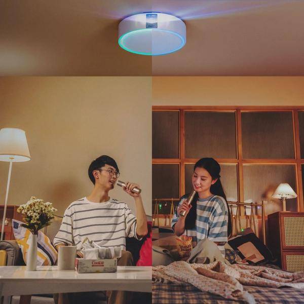 Aladdin投影儀是一款安裝在天花板上的家用智能投影設(shè)備,集智能投影、全光譜吸頂燈和家庭音響功能于一體。為了給用戶帶來(lái)更豐富的使用體驗(yàn),極米團(tuán)隊(duì)推出了麥克風(fēng)和多款配套APP,提供在線K歌、健康助手、動(dòng)態(tài)壁紙等多種智能服務(wù)。尤其是在線K歌功能,讓用戶不僅能一秒把房間變成K歌房,還能與遠(yuǎn)方的朋友一起合唱,讓“獨(dú)樂(lè)樂(lè)”變成“眾樂(lè)樂(lè)”。