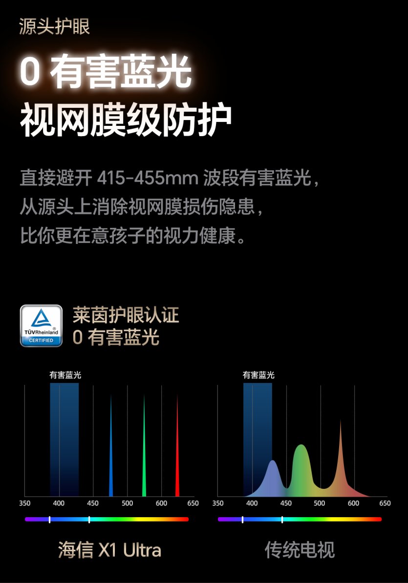 同時,海信激光電視采用純凈激光光源,完全避開415-455納米有害藍光波段,在行業(yè)中唯一實現(xiàn)0有害藍光顯示,從根源上呵護視覺健康。其色彩表現(xiàn)也十分出色,像旗艦級的探索X1系列能達到110% BT.2020色域覆蓋,更接近于自然狀態(tài)下的鮮活視覺體驗。