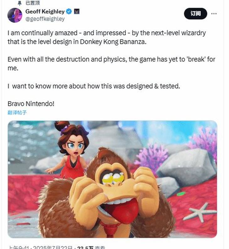 游戲界知名人士、TGA創(chuàng)辦人Geoff Keighley最近在社交媒體上對任天堂最新推出的《咚奇剛:蕉力全開》表達了高度贊賞。