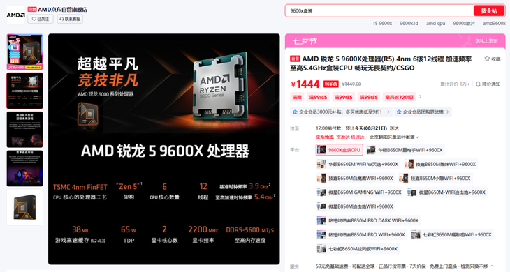 目前AMD 銳龍5 9600X處理器在在京東自營旗艦店3C數(shù)碼七夕節(jié)的最新報價是1449元,京東PLUS會員到手更加優(yōu)惠。成為京東旗艦店會員還有0元入會抽50元E卡,首購返666京豆和曬單抽AMD周邊等活動。目前AMD 銳龍5 9600X處理器的價格算是近期好價,相對平穩(wěn),想要抓住暑期最后時刻在家里暢玩游戲的朋友們抓緊入手吧。