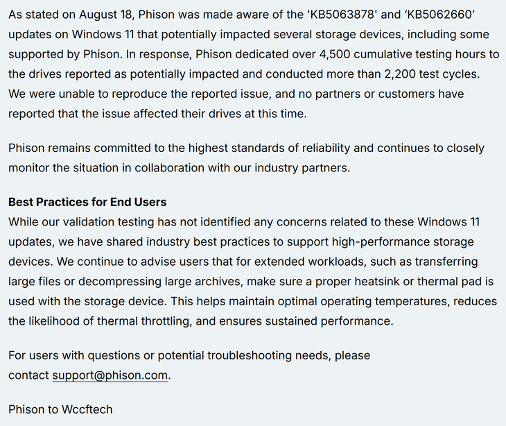 群聯(lián)電子此前也發(fā)布了公告,稱已經(jīng)意識到Windows 11上的‘KB5063878’和‘KB5062660’更新可能會影響到一些存儲設(shè)備,包括群聯(lián)電子支持的一些設(shè)備,理解這可能造成的破壞,并與合作伙伴合作,可能受到影響的主控芯片正在接受審查。但群聯(lián)電子也對媒體公布了最新的表示這一問題無法有效復(fù)現(xiàn),但問題確實(shí)存在,這意味著可能還有其他因素導(dǎo)致了這一問題出現(xiàn)。