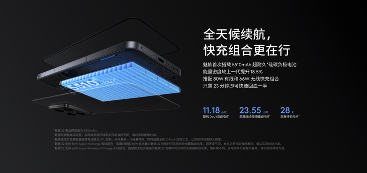 魅族 22 還支持 80W 有線快充與 66W 無線快充,僅需 23 分鐘即可充至 50% 。實驗室數(shù)據(jù)顯示,魅族 22 整機續(xù)航可達 11 小時以上,視頻播放 23 小時,待機更長達 28 天,徹底消除續(xù)航焦慮。