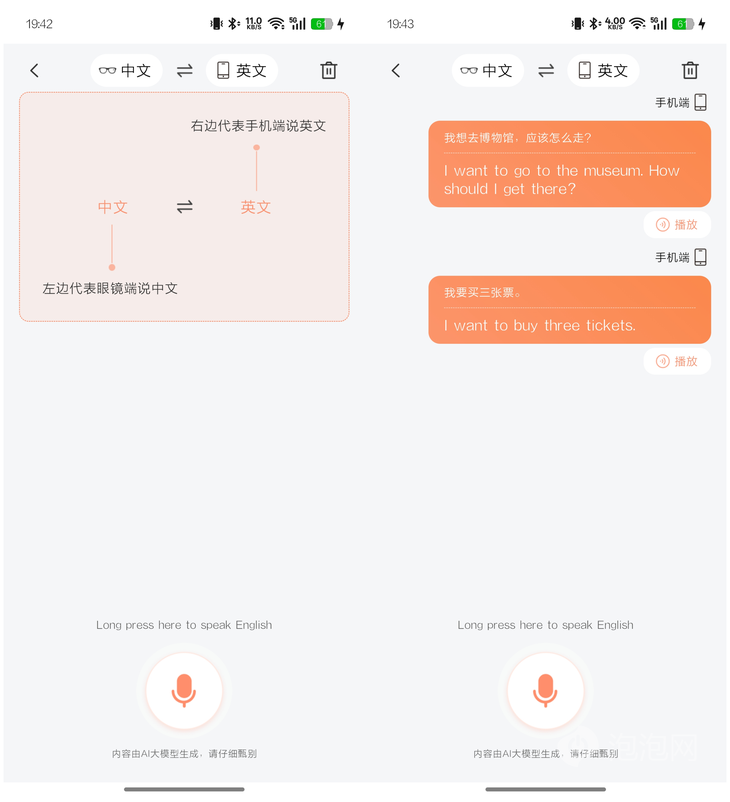 ?戰(zhàn)者天禧智能體眼鏡G1另一個(gè)實(shí)用功能就是對(duì)話翻譯,可以實(shí)現(xiàn)中英互譯,當(dāng)你說完中文,手機(jī)端會(huì)實(shí)時(shí)完成翻譯,并自動(dòng)播放英文,在國(guó)外交流溝通將會(huì)變得更加方便。