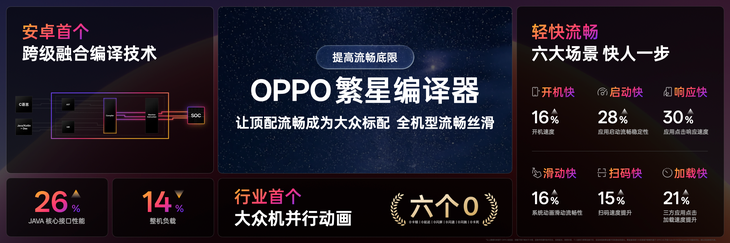 更關(guān)鍵的是,繁星編譯器打通了上層和底層的編譯能力,讓ColorOS 16具備了最前沿的編譯能力,真正的實(shí)現(xiàn)了跨級融合編譯的技術(shù)突破,讓底層和上層代碼能夠進(jìn)行統(tǒng)一編譯優(yōu)化。在繁星編譯器的優(yōu)化下,安卓Java核心接口性能提升了26%,整體負(fù)載降低14%。更重要的是,繁星編譯器驅(qū)動編譯算法效率提升,讓沒有頂配處理器的大眾機(jī),也能有“0卡頓、0延遲、0閃屏、0閃退、0閃跳、0卡死”的“六個0”流暢體驗(yàn),讓機(jī)圈德芙,既是頂配,也是標(biāo)配。
