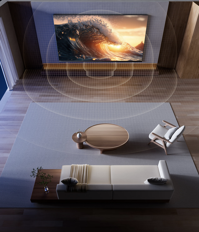 想讓“科技升維藝術(shù)”真正落地,僅靠參數(shù)堆砌遠(yuǎn)遠(yuǎn)不夠,真正的沉浸感來自于聲音與影像共同作用,更來自它們與身體的共鳴。而東芝電視Z700QF正是以火箭炮SOUND音質(zhì)技術(shù)平臺,在四個體驗空間中,構(gòu)建了一種持續(xù)作用的"聲-像-體"拓?fù)渚W(wǎng),讓本次展覽主題《顯聲·視聽拓?fù)洹酚辛司呦蠡谋磉_(dá):