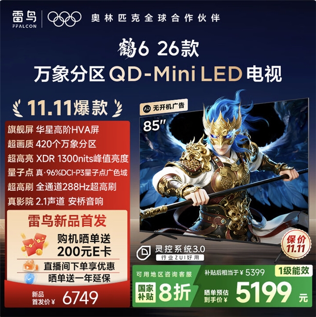 雷鳥鶴6 26款QD-Mini-LED電視的市場(chǎng)意義,在于它實(shí)現(xiàn)了高端技術(shù)的“平權(quán)”。以往,消費(fèi)者在五千元價(jià)位段面臨一個(gè)艱難選擇:是選一臺(tái)尺寸夠大但畫質(zhì)普通的IPS電視,還是加錢上高端MiniLED?