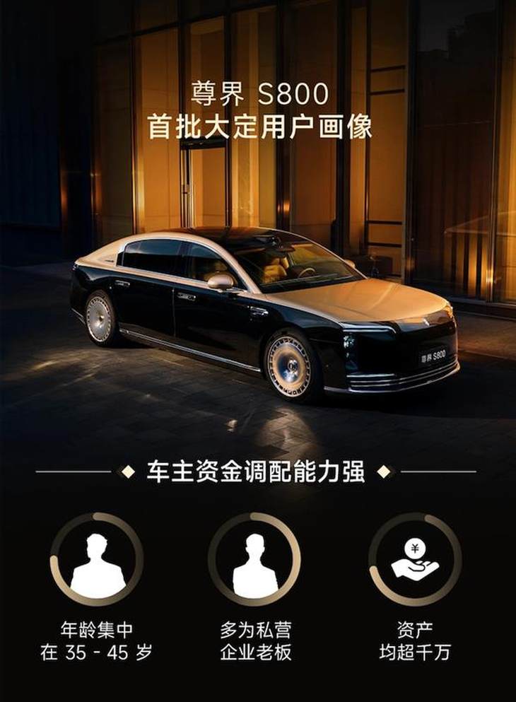 用戶畫像方面,尊界S800的車主以高凈值人群為主,男性占比高達(dá)八成,主要集中在40-50歲人群中。其中,增購用戶占50%,換購用戶約30%,大多是勞斯萊斯、邁巴赫、保時(shí)捷等超豪華品牌的原車主。從配置選擇看,40%的客戶選擇4座星輝行政版,20%選擇頂配4座星耀行政版,而5座版本的兩款車型各占20%。