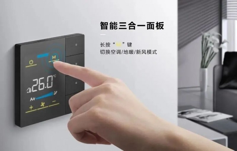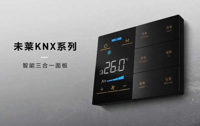 未萊KNX智能三合一溫控面板,集空調(diào)、地暖與新風(fēng)控制于一體,搭配智能按鍵面板,輕松實(shí)現(xiàn)開(kāi)關(guān)、調(diào)光及窗簾的一鍵操控。用戶可自定義場(chǎng)景模式,盡享舒適、安全與便捷的智慧生活體驗(yàn)。