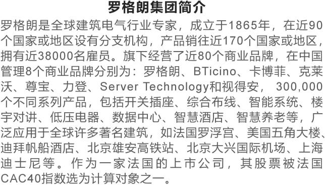 作為 KNX 技術(shù)的發(fā)起者之一,羅格朗在智能建筑系統(tǒng)領(lǐng)域擁有悠久歷史、豐富產(chǎn)品線和全球海量成功案例。推出Living Now、逸遠(yuǎn)煥新、未萊三大系列產(chǎn)品,全面覆蓋住宅、辦公、酒店、醫(yī)院及體育場(chǎng)館等多種場(chǎng)景,為燈光、空調(diào)、窗簾控制、安防及場(chǎng)景化管理提供穩(wěn)定、靈活、高效的智能解決方案。