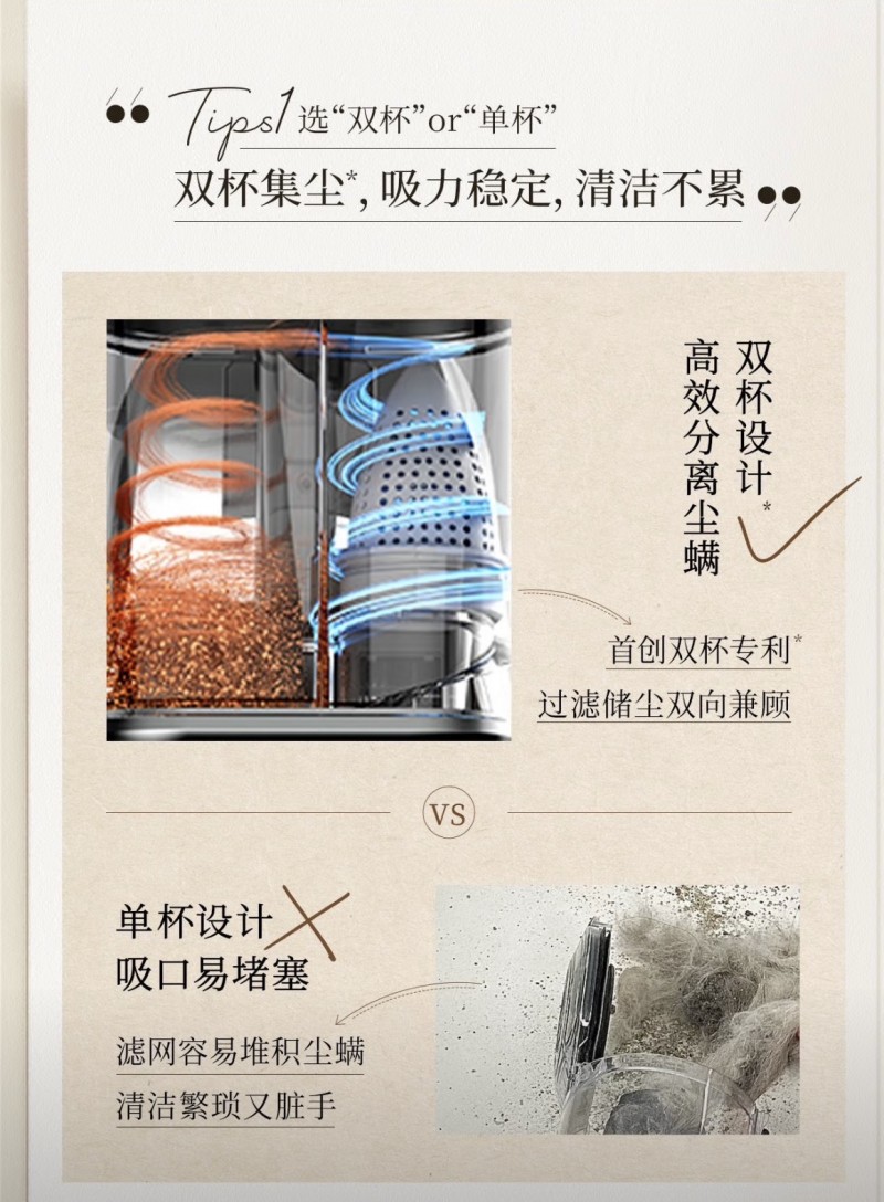 吸力用一次弱三分是除螨儀用戶的共同槽點(diǎn),傳統(tǒng)單塵盒設(shè)計(jì)中,灰塵與空氣混合過濾導(dǎo)致濾網(wǎng)快速堵塞,最終使清潔力斷崖式下降。友望的防纏防堵雙塵杯專利,通過創(chuàng)新結(jié)構(gòu)設(shè)計(jì)從根源解決了這一難題,這也是打動 Tim、促成影視颶風(fēng) TIM 代言友望除螨儀的關(guān)鍵技術(shù)之一。