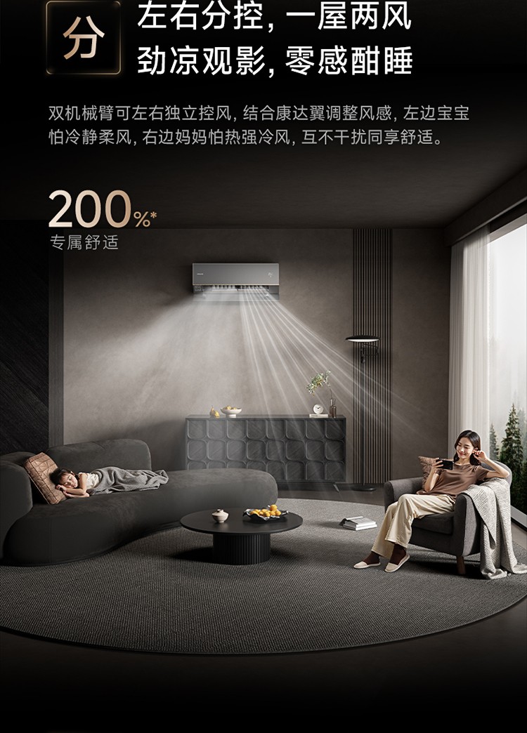 如果說(shuō)0°零感微風(fēng)和126°廣域送風(fēng)是追覓機(jī)械臂空調(diào)成功敲開(kāi)空調(diào)市場(chǎng)大門,那么得益于雙機(jī)械臂設(shè)計(jì)的左右分控,一屋兩風(fēng),互不干擾則將用戶體驗(yàn)提升到新檔次。以往傳統(tǒng)空調(diào)統(tǒng)一風(fēng)感模式,家庭用戶矛盾不斷!強(qiáng)風(fēng)模式,老人怕冷用戶受不了。柔風(fēng)模式,家里怕熱的男士又感覺(jué)不夠熱,這就導(dǎo)致不管空調(diào)怎么設(shè)置,家庭成員總有人不舒服。