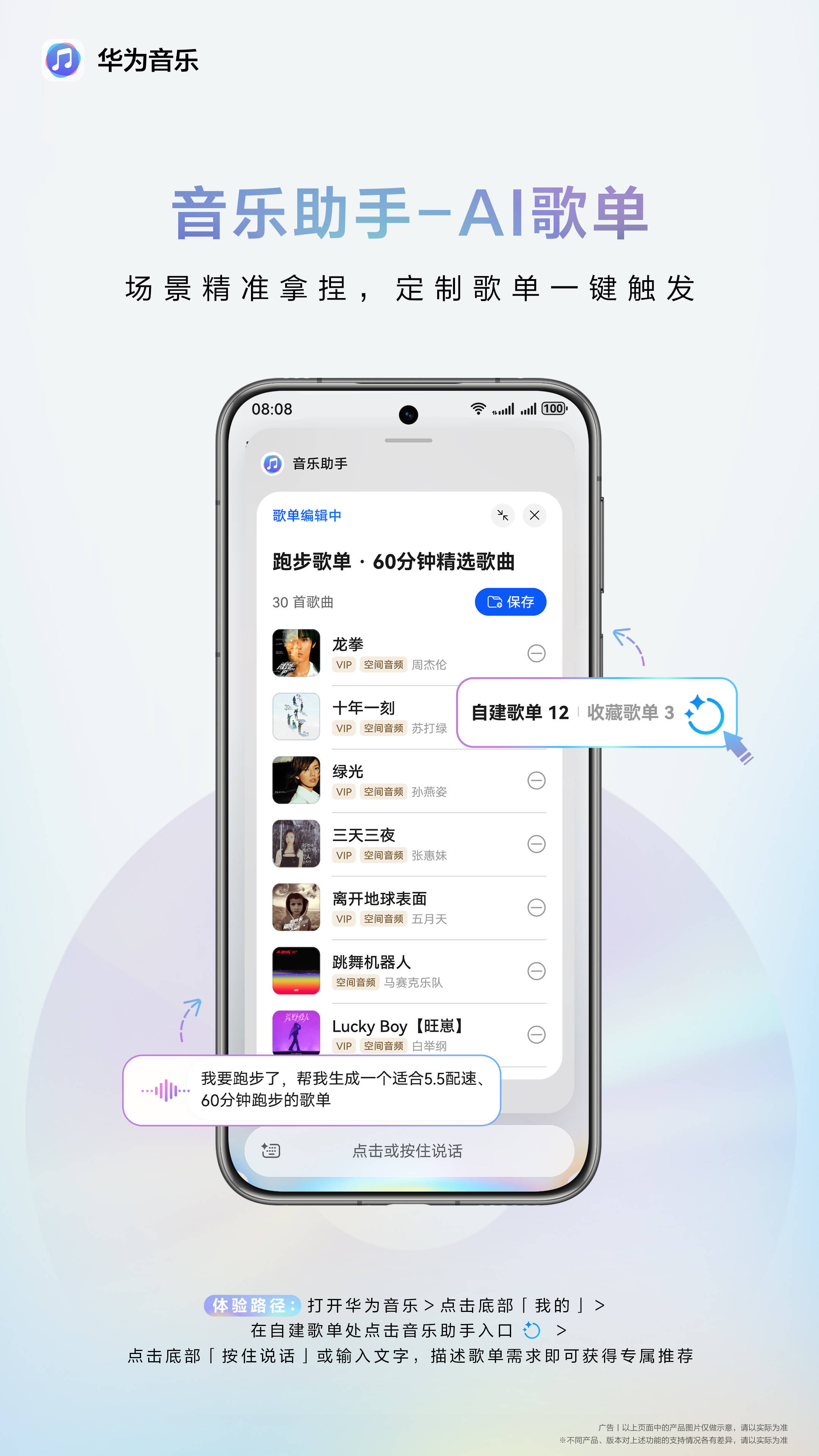 你是否厭倦了千篇一律的推薦歌單?是否在為找不到適合特定場景的音樂而煩惱?華為音樂的“AI歌單”功能,基于小藝智能體平臺先進(jìn)的自然語言處理模型,能夠結(jié)合你的聽歌歷史、偏好、情景、心情等多維度數(shù)據(jù),精準(zhǔn)定制個性化歌單。無論是戶外跑步、派對狂歡,還是深夜加班、周末大掃除,只需在華為音樂-我的中找到“智能圓圈圖標(biāo)”,點擊喚醒音樂助手,長按底部欄說“我要跑步了,幫我生成一個適合5.5配速、60分鐘跑步的歌單”,很快一張專屬歌單便新鮮出爐,支持一鍵保存,徹底告別繁瑣的查找操作。它還會根據(jù)你的反饋動態(tài)調(diào)整,越用越懂你!從此找歌不再費(fèi)神,每個人都能輕松擁有“音樂私人定制”。