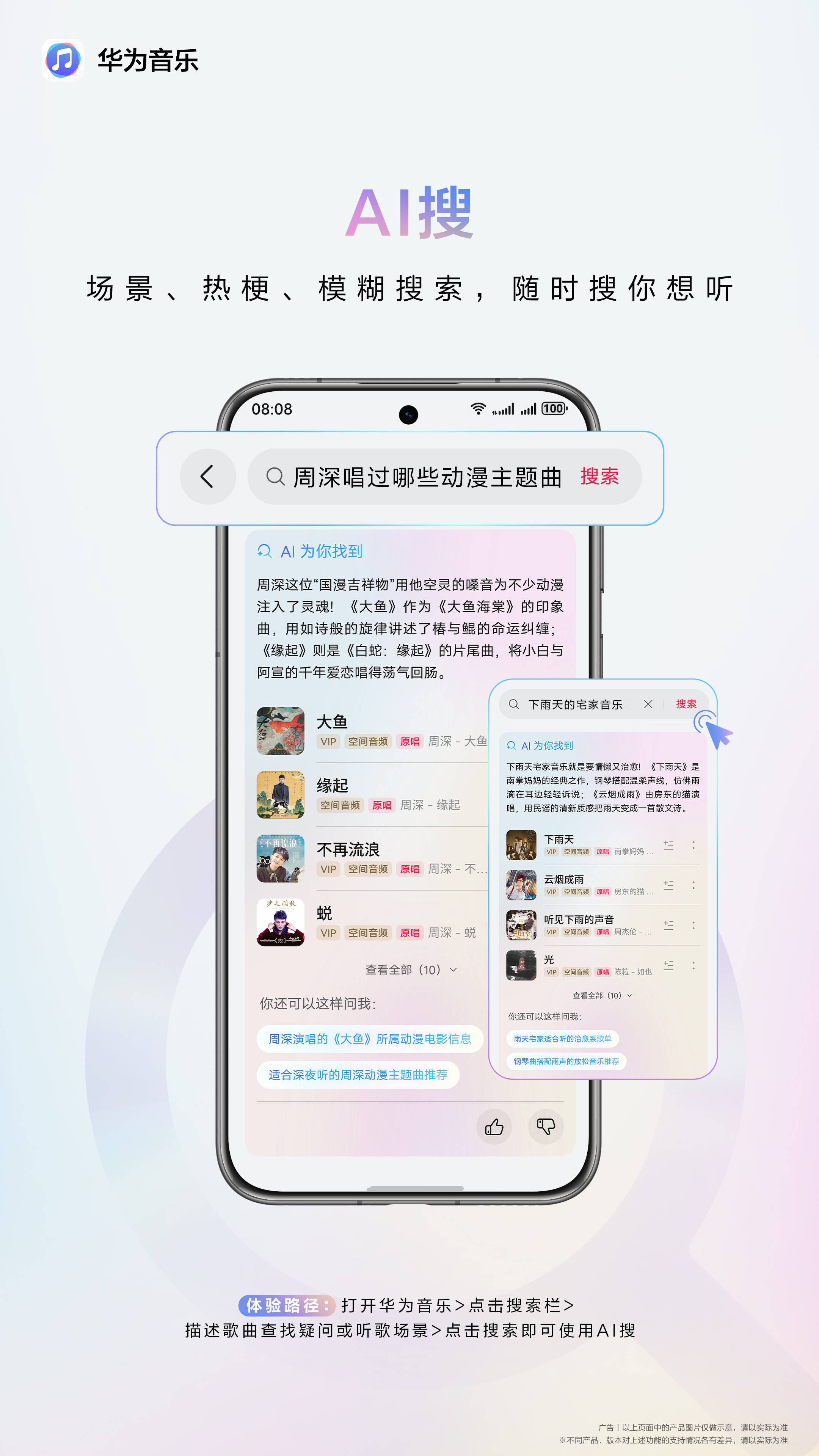 相信不少人都有類似困擾:依稀記得“2025年春晚有首好聽的歌曲”“周深唱過的動漫主題曲”,但就是想不起歌名。華為音樂的“AI搜”功能,依托強(qiáng)大的跨域內(nèi)容知識庫和大模型語義理解等能力,能秒懂需求并精準(zhǔn)找到那首“說不出名字但就是想聽”的歌;基于角色、情節(jié)、畫面等產(chǎn)生的需求,都能被轉(zhuǎn)化為對應(yīng)的歌曲列表。