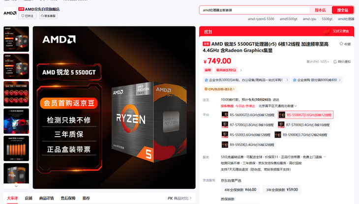 目前AMD 銳龍5 5500GT處理器在京東自營旗艦店11.11促銷的最新報價是749元,成為京東旗艦店會員還有0元入會,首購返666京豆等活動。這款融合了AMD銳龍5000處理器和AMD Radeon Vega顯卡的APU 可以說在千元內毫無敵手,搭配價格更加劃算的DDR4內存相得益彰,對于預算有限同時追求“一機多用”的用戶,這款產品就是最合適的選擇了。