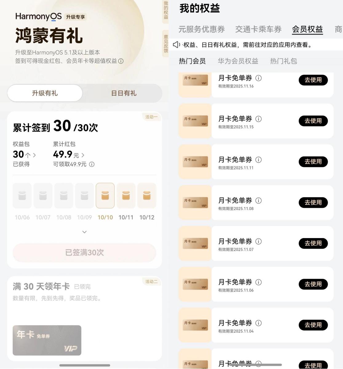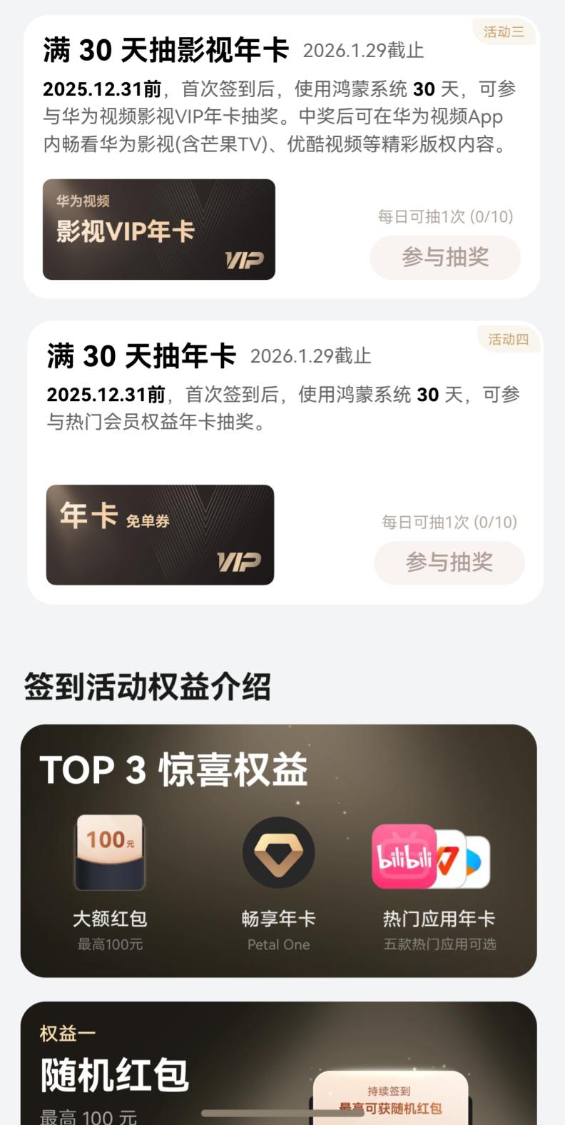 從月度會員到年度權益,華為這波是真想讓用戶實現(xiàn)“會員自由”。已經升級鴻蒙 5.1 或嘗鮮鴻蒙 6 的朋友趕緊沖,每天花10秒簽到,說不定下個月的WPS會員、追劇年卡就有著落了——這白給的福利,不薅真的虧!
