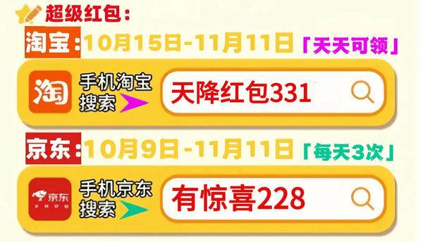 2025淘寶京東雙十一紅包活動(dòng)攻略:淘寶京東雙11紅包口令優(yōu)惠券如何疊加使用?