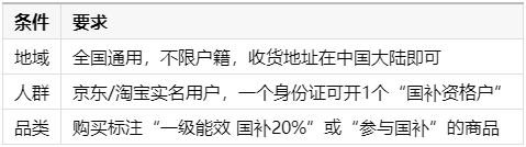 A:一個(gè)身份證可在京東、淘寶各開1個(gè)“國(guó)補(bǔ)資格戶”,每品類限領(lǐng)1次。