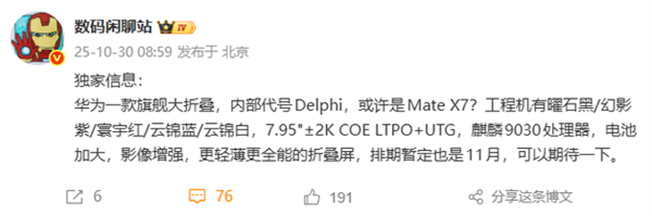 華為即將推出的新一代旗艦折疊屏手機(jī)正在緊鑼密鼓地準(zhǔn)備中。今日有數(shù)碼博主曝光稱(chēng),這款新品內(nèi)部代號(hào)為“Delphi”,預(yù)計(jì)命名為華為Mate X7,暫定于11月發(fā)布。從曝光的信息來(lái)看,這款新機(jī)將擁有曜石黑、幻影紫、寰宇紅、云錦藍(lán)、云錦白五種配色,繼續(xù)延續(xù)華為在高端設(shè)計(jì)上的審美與質(zhì)感。其內(nèi)屏尺寸為7.95英寸,支持2K分辨率,并采用UTG超薄柔性玻璃,兼顧清晰度與耐用性,為用戶帶來(lái)更出色的視覺(jué)和操作體驗(yàn)。