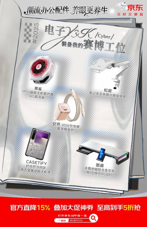 未來感與實用性兼?zhèn)涞碾娮覻3K工位,是不少潮人的追求。黑鯊5Pro磁吸手機散熱器AG聯(lián)名版,冷酷外觀下確保高性能持久輸出,游戲辦公都不掉線。松能筆記本支架臂升降旋轉架,懸停自由,節(jié)省寶貴桌面空間。安克45W充電器套裝,小巧體積蘊含巨大能量,快速恢復設備狀態(tài)。CASETiFY時尚芭莎同款液態(tài)金屬涂鴉手機殼,金屬質(zhì)感與街頭涂鴉碰撞,科技單品亦是潮流配飾??犷1痣娔X鋁合金支架,集成PD快充與RGB光效,氛圍感與實用性拉滿。