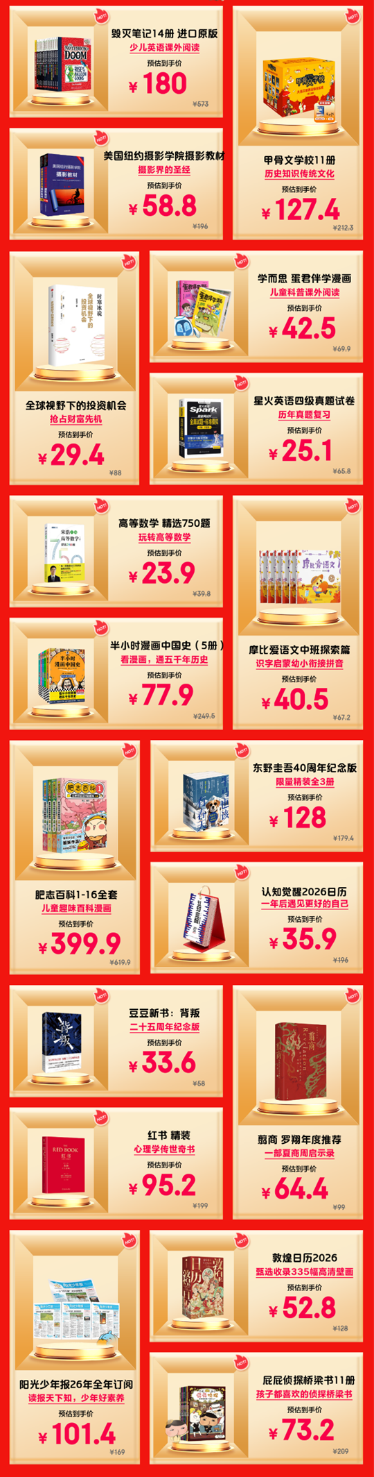 除了自我提升,孩子的教育成長也備受關(guān)注。想讓孩子告別枯燥閱讀,在趣味中漲知識、拓視野?《學(xué)而思 蛋君伴學(xué)漫畫》作為熱門兒童科普課外讀物,能有效激發(fā)孩子的探索欲,預(yù)估到手價42.5元;如果想讓孩子系統(tǒng)了解多學(xué)科知識,《肥志百科1-16全套》是較好選擇,用幽默漫畫解讀復(fù)雜知識,預(yù)估到手價399.9元,一次入手滿足長期閱讀需求;還有正在熱銷的《半小時漫畫中國史(5冊)》,它以生動的漫畫形式梳理五千年歷史脈絡(luò),特別適合幫助孩子建立清晰的歷史框架,77.9元就能讓孩子輕松愛上閱讀。