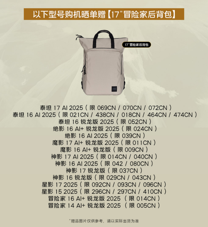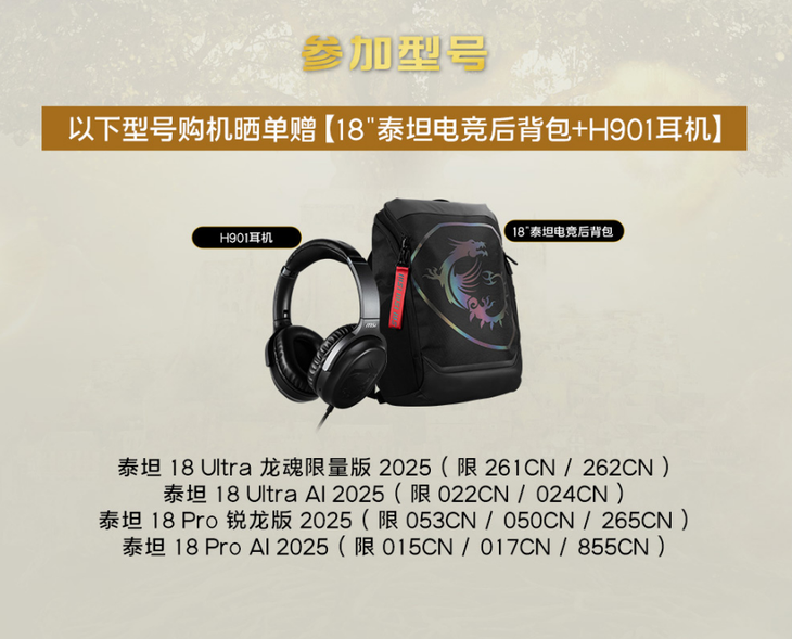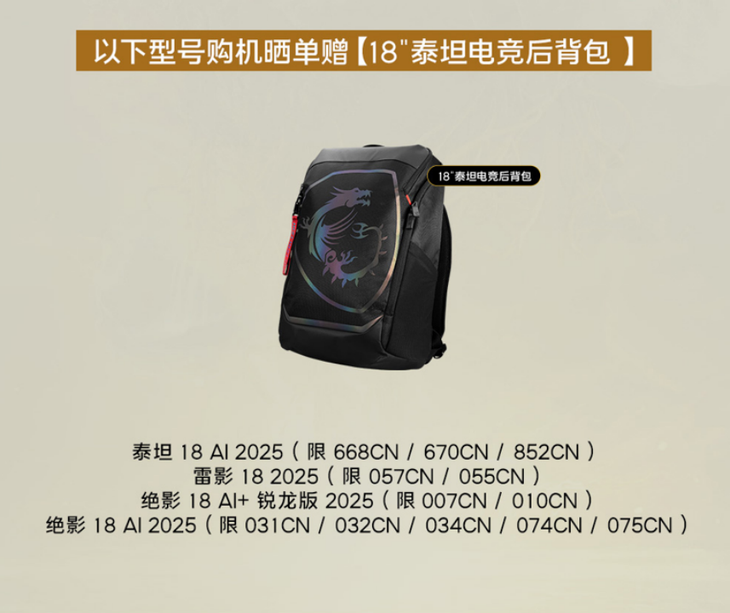特別值得關(guān)注的是,微星為雙11準備了豐厚的曬單好禮?;顒悠陂g購買指定型號微星游戲本的玩家,只需完成曬單即可參與買贈好禮,購買不同機型,曬單贏的好禮不同,其中包括18英寸泰坦電競后背包+H901耳機組合、18英寸泰坦電競后背包單品和17英寸冒險家后背包單品等,讓您在享受高性能設備的同時,更有機會贏取額外驚喜。