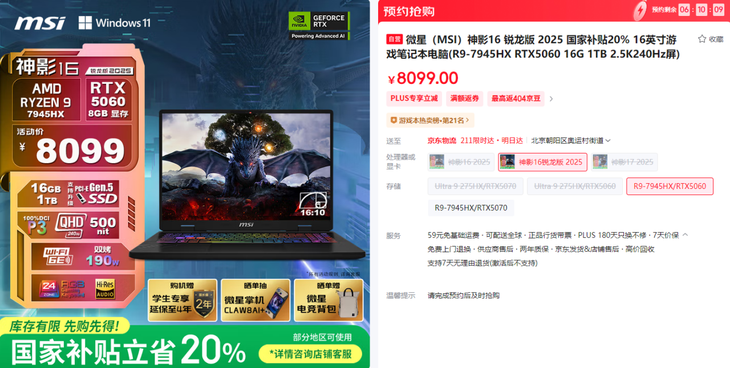 特別值得關(guān)注的是,部分地區(qū)享受"國補"優(yōu)惠政策,購買微星電競本最高可節(jié)省20%的購機費用。即使不在國補覆蓋區(qū)域的消費者,也能享受平臺提供的多種優(yōu)惠券和補貼活動,整體優(yōu)惠力度依然可觀。