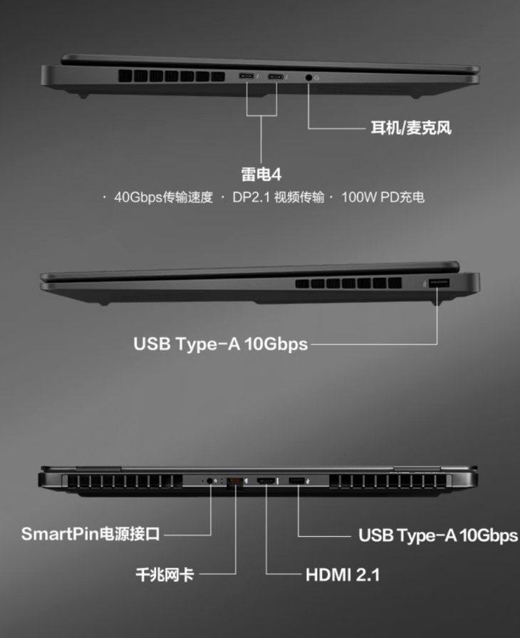 接口方面更是 “一步到位”:左側(cè)雙雷電 4(支持 USB4 40Gbps 傳輸、100W PD 充電、DP 2.1 視頻輸出)+ 耳機(jī)麥克風(fēng)二合一接口,右側(cè) 1 個(gè) USB-A 3.2,后側(cè) DC 電源接口 + RJ45 千兆網(wǎng)口 + HDMI 2.1+1 個(gè) USB-A 3.2。出差時(shí)不用帶笨重的拓展塢,接外接屏、移動(dòng)硬盤、網(wǎng)線都方便;就算在酒店里想連顯示器剪片,一根 HDMI 線就能搞定,效率拉滿。