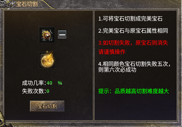 完美寶石需要通過切割對應(yīng)的寶石來獲取,但有一定的失敗幾率,同時(shí)游戲也加入了“5次失敗后第6次必成功”的保底機(jī)制。由于切割失敗后原始寶石也會(huì)消失,因此推薦玩家將高品質(zhì)的原始寶石直接裝備,不必去冒險(xiǎn)切割。