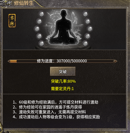 在角色達(dá)到60級、修為達(dá)到上限后,玩家就可以進(jìn)行渡劫,渡劫成功則回到1級,利用獲得的獎(jiǎng)勵(lì)作為起步助力,開啟新的成長階段。