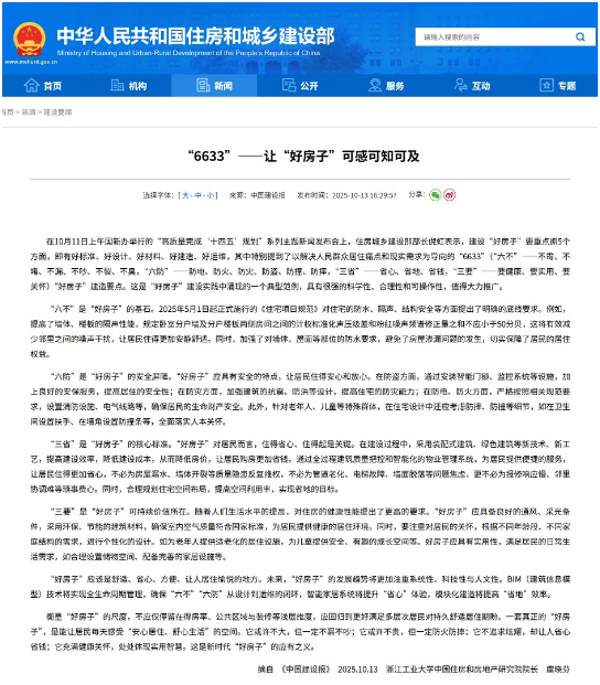 住建部部長倪虹以“6633”標(biāo)準(zhǔn)系統(tǒng)闡釋了“好房子”應(yīng)具備的基本特質(zhì)