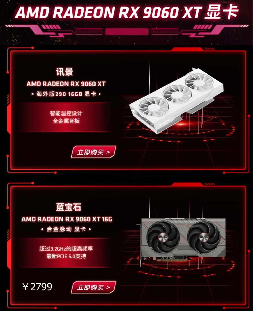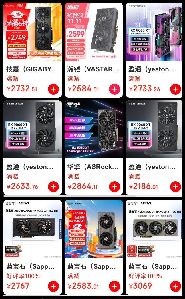 目前,AMD京東自營旗艦店的RX 9060 XT顯卡品牌包括:藍(lán)寶石、瀚鎧、華擎、盈通等一線品牌。11.11京東大促價格參與平臺活動均可以低于3000元的價格入手,而京東PLUS會員到手還能更加優(yōu)惠,成為京東旗艦店會員還有0元入會抽100元E卡,首購返666京豆和曬單抽AMD周邊等活動。對于想要入手一款能夠暢玩1080P和2K畫質(zhì)游戲顯卡的玩家,3000元檔位的預(yù)算,AMD Radeon RX 9060 XT是大家不二之選,現(xiàn)在趁著11.11京東大促活動期入手,更加劃算!