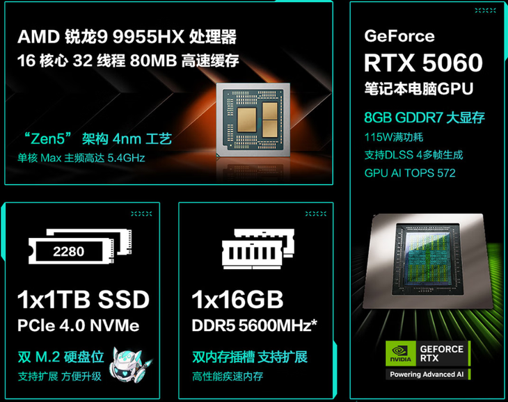 配置方面,這款產(chǎn)品搭載的 AMD 銳龍 9 9955HX 移動處理器采用了 4 納米制程工藝的“Zen 5”架構(gòu),超高能效比帶來了 130W 即可滿血性能釋放的先天優(yōu)勢,高負(fù)載環(huán)境穩(wěn)定且安靜,帶來“冷靜”的游戲體驗(yàn)。