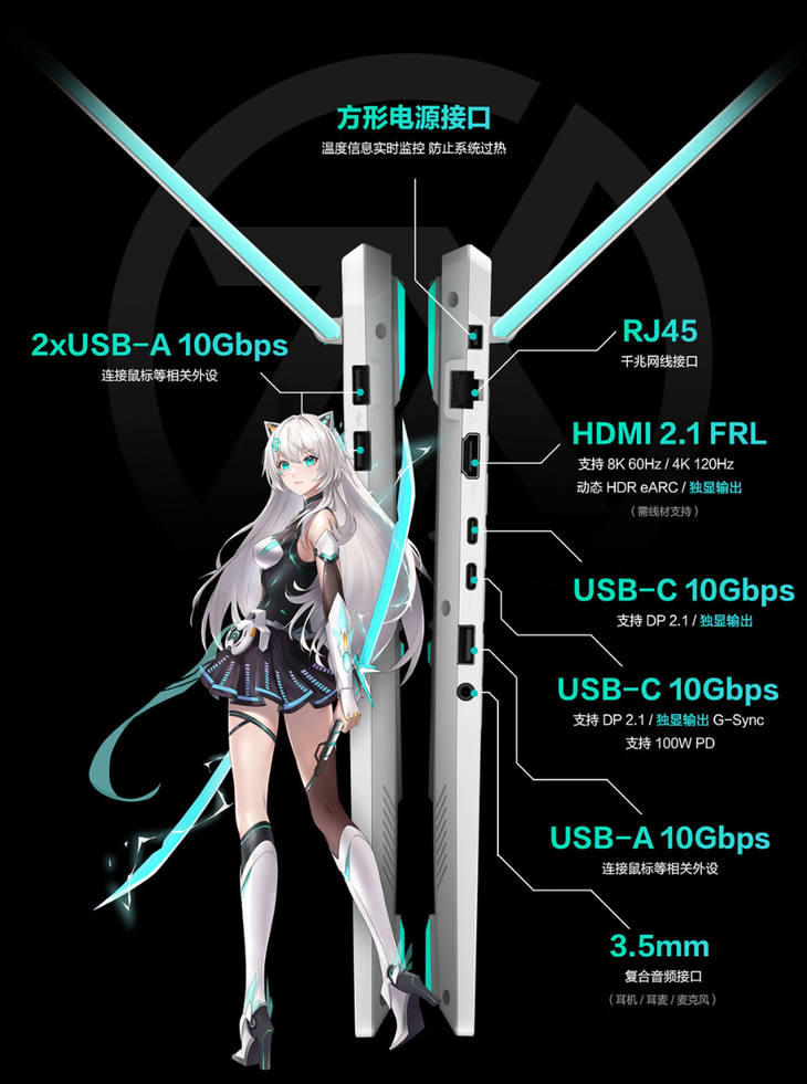 華碩天選6 Pro銳龍版擁有3個USB-A 10Gbps、2個USB-C 10Gbps接口,且雙C口均支持DP 2.1協(xié)議,可外接超高刷電競顯示器。HDMI 2.1 FRL接口滿血輸出,支持至高8K@60Hz輸出。另有RJ45網(wǎng)口,支持Wi-Fi 6E,游戲電競暢聯(lián)不掉線。此外電源接口也全新升級為方形接口,支持溫度信息實(shí)時監(jiān)測,防止系統(tǒng)過熱。