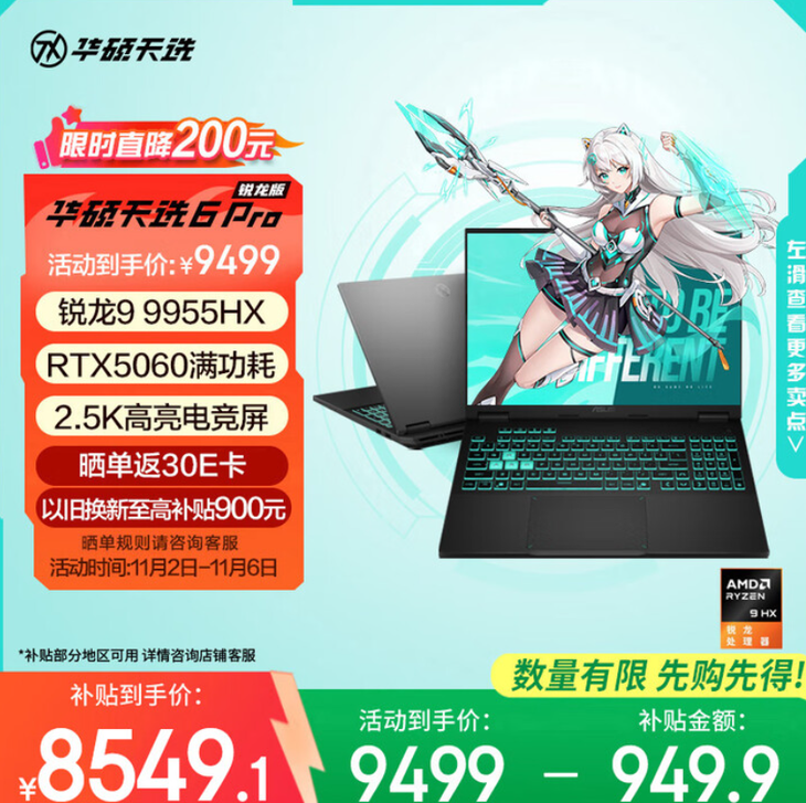 華碩天選6 Pro銳龍版官方售價9499元,雙十一期間補(bǔ)貼到手價8549.1元,想要入手的用戶現(xiàn)在就可以下單了。