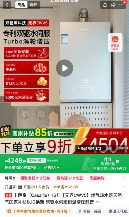 卡薩帝無界CWV5燃氣熱水器,AI定制恒溫水,溫度始終剛剛好,創(chuàng)新瀑布洗科技,搭載Turbo渦輪增壓技術(shù),水量翻倍,獨嵌兩用不設限,從容適配多種家居布局,一級靜音認證守護安心睡眠,七重母嬰凈水洗科技,深度阻垢抑菌。京東11.11下單享9折和國家補貼85折,到手價4248元,還享全免安裝服務。