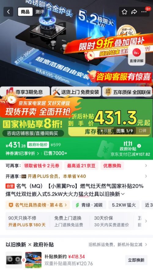京東11.11廚衛(wèi)煥新 名氣小黑翼Pro燃氣灶431元起