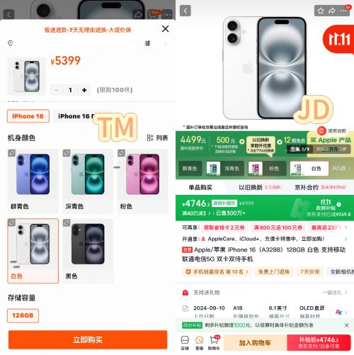 想要購買iPhone 16系列的朋友也要注意,在TM下單iPhone 16 128G不享受任何優(yōu)惠,需要5399元,而在JD下單可享500元國補和以舊換新補貼,到手價4499元起,差價可是高達900元。