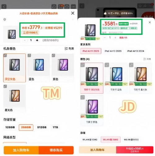 不僅是手機,iPad 11 Air 256G在TM雙十一立減1100元后的標價為3779元,但在JD,同款限時直降1300元,還能疊加10%的政府補貼,PLUS會員最終到手價更低,價比TM便宜近200元。省下的錢足夠購買一個原裝手機殼了。