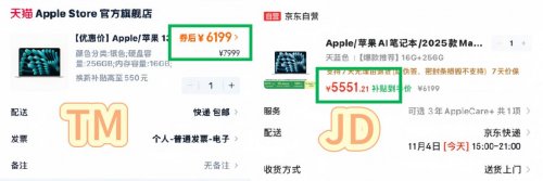 類似的還有MacBook Air M4 16G+256G,在JD領政府補貼后到手價5551元,而同款在TM的價格是6199元,比JD貴648元,可以再買一個妙控鼠標和保護殼了。對于想要入手的消費者來說,這個差價確實值得斟酌。
