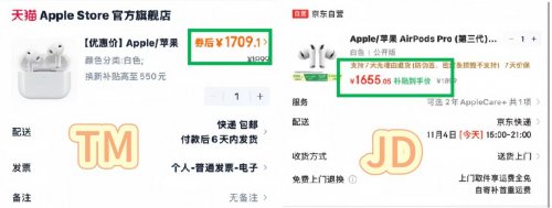AirPods Pro 3代的價格也不例外,TM券后價1709元,在JD領取國補后立減,到手價只需1655元,比TM便宜54元,剩下的錢可以點一頓不錯的外賣了。