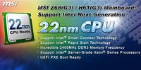 ????泡泡網(wǎng)主板頻道4月26日?早在變Ivy Bridge發(fā)布前,微星就宣布了旗下H61主板新的BIOS,全面支持Intel最新的22nm處理器,伴隨IVB正式發(fā)布,微星旗下H61主板也全面準備就緒,除了支持IVB處理器,產(chǎn)品還支持雙通道DDR3 2400內(nèi)存。 ??? 為了給用戶提供更長的使用周期,微星針對旗下H61全面退出了新的支持ME8固件,全面支持最新的22nm Ivy Bridg