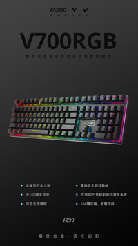 RAPOO雷柏,領(lǐng)軍國(guó)產(chǎn)外設(shè)品牌,實(shí)力大廠上市企業(yè)發(fā)布的V700RGB合金版幻彩背光游戲機(jī)械鍵盤,1680萬(wàn)色的幻彩RGB背光系統(tǒng),19種的燈光模式,并支持單鍵背光可獨(dú)立設(shè)置。金屬的鋁合金上蓋,全鍵無(wú)沖突,全鍵可編程等諸多亮點(diǎn)集一身的雷柏V700RGB合金版,強(qiáng)大的驅(qū)動(dòng)軟件也讓鍵盤的可玩性獲得更大的提高,售價(jià)僅為299元,相信它一定會(huì)成為你首選的游戲利器,給你暢快的游戲操作體驗(yàn)。
