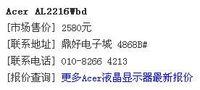 ??? 【泡泡網(wǎng)LCD頻道11月22日訊】今天出來(lái)上班的時(shí)候感覺(jué)有點(diǎn)兒冷,似乎有什么預(yù)兆。嘿!您別說(shuō),這預(yù)感有時(shí)候還真有點(diǎn)準(zhǔn)。今天小編在某某知名IT網(wǎng)站上看到一條極為震驚的消息:Acer AL2216w僅售2580元!??此為截圖??? 根據(jù)本站記者采集回來(lái)的行情,Acer AL2216w在北京的最低價(jià)應(yīng)該在2699元左右(未稅價(jià)),看到如此重磅的消息,小編第一時(shí)間打電話過(guò)去詢問(wèn)……??? 小編: