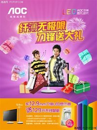 ????泡泡網(wǎng)液晶顯示器頻道10月22日? ● 活動時間:2010年10月1日-10月31日 ● 活動內(nèi)容:活動期間、凡購買AOC刀鋒系列任意一款顯示器(e2043F/e2243Fw/e2343F)一臺,即可獲得增價值129元超薄無限光電鼠標(biāo)一個,數(shù)量有限,先買先得?。ㄌ貎r、行單不參與活動) ??? AOC“刀鋒”系列液晶是全球最薄的顯示器機(jī)型,僅有12.9mm的厚度,目前購買贈送價值1