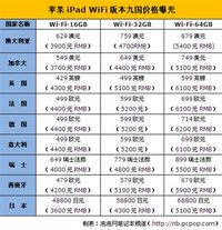 ????泡泡網(wǎng)資訊頻道9月15日?蘋果公司周一宣布,9月17日(本周五)Wi-Fi版的iPad將登陸中國內(nèi)地市場,起售價(jià)為人民幣3988元。讓我們對比一下其他國家的售價(jià),計(jì)算一下到底貴不貴吧。 ??? 為便于對比,我們就以Wi-Fi版16GB的iPad為例,將其售價(jià)折算成人民幣后進(jìn)行比較。 ??? 蘋果iPad首先在美國上市,Wi-Fi版iPad 16GB售價(jià)為499美元,折算后,約為人民幣3