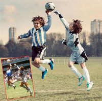 ??? 1986年世界杯,在阿根廷對(duì)陣英格蘭的比賽中,馬拉多納上演了上帝之手,“一半是天使,一半是魔鬼”,兩位小球員完美的模仿了這一幕,從發(fā)型到表情,兩人模仿的惟妙惟肖。馬拉多納上帝之手??? 這一幕對(duì)于英超球迷而言非常熟悉,1995年1月25日,面對(duì)水晶宮球迷馬修-西蒙斯的挑釁,坎通納飛起一腳。這幅擺拍圖,不僅兩位主角的演繹非常到位,連群眾演員的表情都同當(dāng)時(shí)的氣氛吻合。坎通納飛踹球迷??? 20