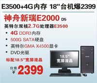 ????泡泡網(wǎng)電腦頻道11月11日?神舟新瑞E2000是一款不可多得的精品臺式電腦!純黑色外觀打造,18.5吋寬屏液晶顯示,配備雙核2.7GHz處理器E3500,4G DDR3內(nèi)存和英特爾集成顯卡GMA X4500的完善配置,為整機提供了強勁動力,輕松應(yīng)對多重任務(wù),帶給您近乎完美使用體驗!目前該機僅售2399元,無疑是您辦公、娛樂的首選! 18.5吋精細(xì)畫質(zhì) 影音盛宴 ??? 黑色一直是穩(wěn)