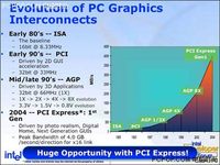 談到IT產(chǎn)業(yè)的發(fā)展,我們永遠(yuǎn)離不開“更新?lián)Q代”這個(gè)話題。從摩爾定律誕生起,“升級”就伴隨著每一個(gè)用戶。回顧圖形卡接口總線的發(fā)展歷程,從早期80年代的ISA總線、90年代引入2D圖形加速的PCI總線,再到具備2D/3D加速的AGP8×總線規(guī)格,Intel一直扮演著業(yè)界標(biāo)準(zhǔn)的領(lǐng)路人,也一直在馬不停蹄地帶領(lǐng)業(yè)界穩(wěn)步向前。而在03年的IDF中,Intel再次向業(yè)界描繪了圖形卡接口總線的發(fā)展方向——雙向
